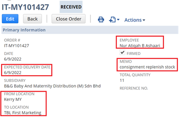 Save the transfer order, a transfer order number will be generated.